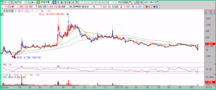 최근 증시흐름이 좋지않았던 탓에 RSI 수치가 30이하로 하락하면서 과매도 구간에있었음을 보여주었었지만 국제약품은 금일 1800원 상승한 7820원으로 29.9%상승한 상한가 마감했습니다.
